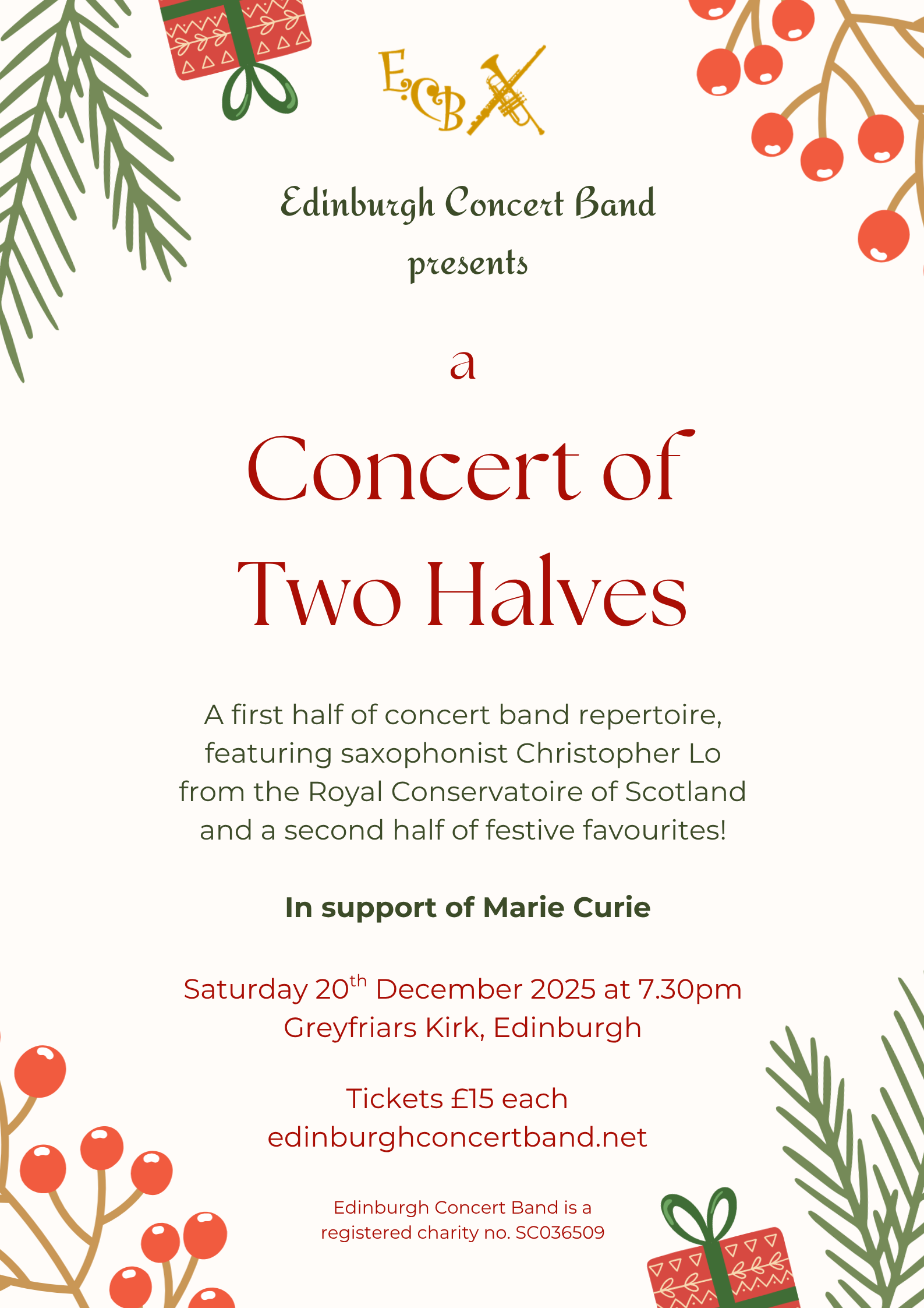 | Description: | We're pleased to announce our Concert of Two Halves. A first half of concert band repertoire, featuring saxophonist Christopher Lo from the Royal Conservatoire of Scotland, and a second half of festive favourites! This year we will be supporting Marie Curie. We'll share more information on our socials and on the night about how to donate. ![]() |